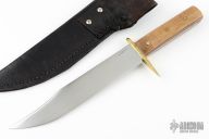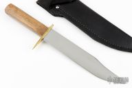 This bowie by Robert Birch features a hand rub satin finished blade with a false top edge, .150" blade stock and 1.481" blade depth, full tang construction. The handle has a brass guard with oak scales and brass pins. Comes with a black leather sheath. Has some light scratches , excellent condition otherwise.