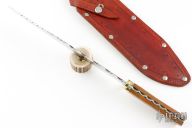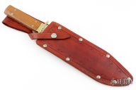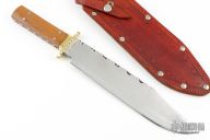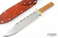 This Bowie by R Cliden features a satin finished blade with fileworked spine, .159" blade stock and 1.988" blade depth, full tang construction. The handle has a fileworked brass guard, wood scales with a fileworked tang. Comes with a hand tooled brown leather sheath. Has a few light scratches, otherwise excellent condition.