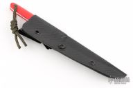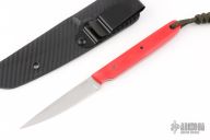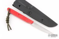 This knife by David Lancaster Clark features a satin finished blade, .095" blade stock and .595" blade depth, full tang construction. The handle has red G10 scales scales. Comes with a kydex sheath. New from maker.