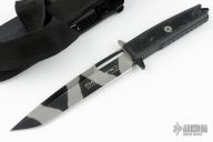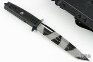 This Dobermann II Fighter has a camo N690 Cobalt stainless steel drop point tanto blade with hidden tang, Blade width is .25", depth 1.267". Handle is black non-slip Forprene with lanyard hole. Comes with nylon sheath and original box. Has some scuffs and scratches, great condition otherwise.