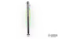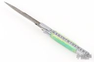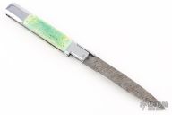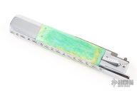 This Picklock Auto by Agasi Hambartsumian of Armenian Doctor Knives features a Damascus bayonet ground blade with a false top edge. The handle has a polished stainless steel frame with fileworked stainless steel backspacer, dyed bone scales with brass pins. New from maker. This one has be held tight to fire all the way. The maker said it should break in overtime. If you hold it tight, or with two hands, it fires properly. Just needs a little break in period.