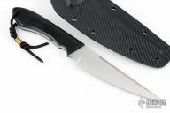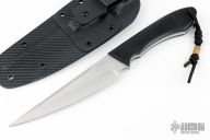This Fighter by David Lancaster Clark features a satin finished, hollow ground blade, .188" blade stock and 1.450" blade depth, full tang construction. The handle has black G-10 scales with gray G-10 liners. Comes with a kydex sheath.  New from maker.