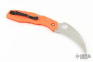 This SpyderHawk by Spyderco features a satin finished fully serrated hawkbill blade with thumbhole, orange FRN frame and black stainless steel tip up clip. New condition. Comes with original box and papers.
