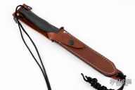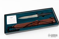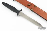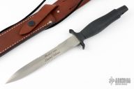 This Mark II #A01086 by Gerber has a satin finished double-edged blade with partial serrations and hidden tang. 7/32" stock, 7/8" depth. Handle is black Armorhide with double guard and lanyard hole. Excellent condition. Comes with Gerber brown leather sheath and original box and paperwork. This knife is one of 1500. Blade says "Mark II 2002 Limited Edition". Excellent Condition.