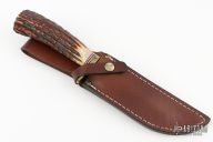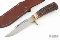 This Classic Blades Skinner from Blackjack Knives features a mirror finished blade with false top edge, .215" blade stock and 1.131" blade depth, hidden tang construction. The handle has a brass guard with red, white and black spacers and a stag grip. Includes a brown leather sheath with belt loop and original box. Has a couple light scratches, otherwise excellent condition.