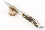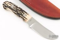 This skinner by Vaughn Neeley of Timberline Knives features a satin polished semi-skinner style blade with .193" blade stock and 1.165" blade depth, full tapered tang construction with stag scales. Comes with a brown leather sheath. Has a couple very light scratches, otherwise excellent condition. "010TC" on the blade.