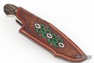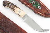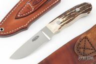 This hunter by Vaughn Neeley of Timberline Knives features a satin polished blade with .175" blade stock and 1.114" blade depth, full tapered tang construction with stag scales. Comes with 2 hand tooled brown leather sheaths. Has a couple very light scratches, otherwise excellent condition. "010TA" on the blade.