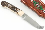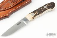 This Bird and Trout by Vaughn Neeley of Timberline Knives features a satin polished blade with .121" blade stock and .891" blade depth, full tapered tang construction with stag scales. Comes with 2 hand tooled brown leather sheaths. Has a couple very light scratches, otherwise excellent condition. "010TB" on the blade.