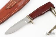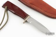 This hunter by AG Russel features a satin finished drop point blade with notched thumbrest, .120" blade stock and .850" blade depth, hidden tang construction. The handle has a nickel silver guard, red linen micarta grip with aluminum butt. Comes with a brown leather sheath. Has some light scratches, otherwise good condition.