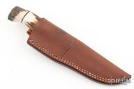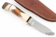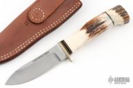 This Morseth Hunter (1995) was made by Bob Dozier for AG Russell under the Morseth Patent. It has a satin finished stainless steel drop point blade with hidden tang. Blade width is just under .173", depth is .932". Handle is 3-piece stag with red, black, and white spacers, nickel silver guard, and brass pommel screw. Comes with a brown leather sheath with belt loop. Excellent condition.