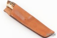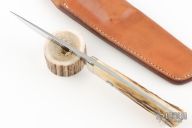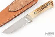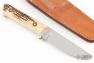 This hunter by Bernard Sparks features a mirror polished drop point blade, .174" blade stock and 1.006" blade depth, full tapered tang construction. The handle has a nickel silver guard and stag scales. This knife feels great in the hand - well-balanced and fitting. Comes with a brown leather sheath. Excellent condition.