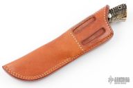 This Big 7 by Jimmy Lile (DOT) features a satin finish blade with .175" blade thickness and 1.043" blade depth, full tapered tang construction. The handle has a nickel silver guard and pins, sheeps horn scales with red liners. Includes a brown leather sheath. Excellent condition.