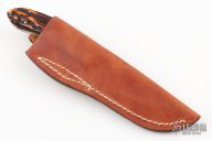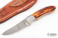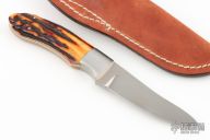 This knife by Russell Easler features a hand rub satin finished blade with .130" blade stock and .807" blade depth, full tapered tang construction. The handle has dovetailed stainless steel bolsters, stag scales with red liners. Comes with a brown leather sheath. Excellent condition.