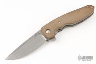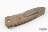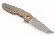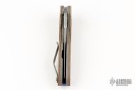 This model '82 flipper from Nalu Boersma features a blasted finish polished blade with false top edge. The handle features green micarta scales with bead blast finished liners. The backspacer is timascus and has has a bead blast finished tip up clip. Blade is centered when closed, flips well with no wrist action needed, and locks open with no blade play in either direction. Knife is in excellent condition and shows only light signs of handling.