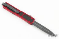 This Makora OTF automatic by Microtech features a black double edge blade. The handle has a black aluminum frame with nonslip inlays. Black stainless steel clip, tip down carry. Dated 05/2004 and 1833 on clip. Comes with original nylon belt sheath. Fires hard. Has some scuffs on the blade and clip, great condition otherwise.