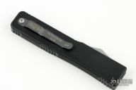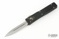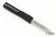 This Early Ultratech by Microtech Knives features a satin d/e blade and fullers. The handle has a black anodized aluminum with ramped steel thumb slide and tip down clip. S/N of 02287 dated 06/2004. Comes with original nylon belt sheath. Has a couple light scuffs on the frame and clip, excellent condition otherwise.