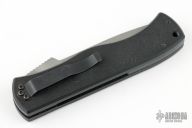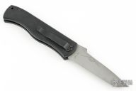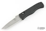 This 9700 Automatic is an Emerson Design executed by Benchmade. It features a bead blasted, chisel ground tanto style bade with swedge and notched thumb ramp. The handle is comprised black G10 scales over a black polymer backspacer. The black coated steel clip is positioned for tip down, right hand carry. Lanyard hole in pommel.  Rare and hard to find.  Comes with original box and papers. Has some light scuffs, otherwise excellent condition.