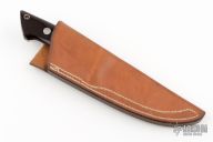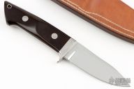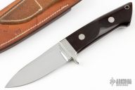 This Semi-Skinner by Herman Schneider features a mirror finished blade with .187" blade stock, 1.168" blade depth, full tapered tang construction. The handle has stainless steel guard, black linen micarta scales with red liners. Comes with a brown leather sheath. Excellent condition. #158