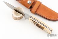 This knife by G.W Stone features a satin finished blade with integral guard and a notched thumbrest, full tapered tang construction with .133" stock with a depth of .962". The handle has stag scales with aluminum pins and lanyard hole. Comes with a brown leather sheath. Excellent condition. Numered #74. Excellent condition.