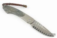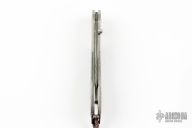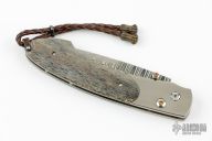 This Spearpoint button lock folding knife features a damascus blade and a titanium frame with fossil mammoth bone scales. Spessartite inlays in thumb stud and button lock. Sterling silver bail and beads. Numbered 063/500. Blade Steel: 'Wave' Pattern ZDP-189 Core Damascus @ HRC 67