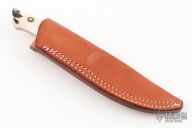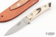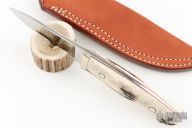 This R.W. Loveless design Semi-Skinner by Beretta features a mirror polished drop point blade with .191" blade stock and .995" blade depth. The handle is comprised of a nickel silver guard and stag scales over full tapered tang construction. Lanyard tube in pommel. Comes with a brown leather sheath. Excellent condition. #059