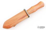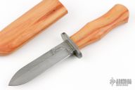 This fighter by Dan Stranahan features a Damascus blade with a false top edge, .200" blade stock and 1.030" blade depth, hidden tang construction. The handle has a Damascus guard, wood grip with nickel silver pins. Comes with a wood sheath and leather belt loop. Has a few light scratches and patina. Great condition otherwise.