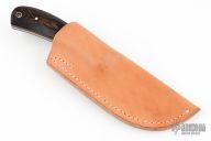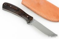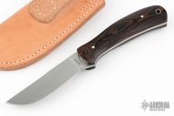 This knife by Dan Stranahan features a satin polish finished blade with a false top edge, .120" blade stock and .99" blade depth, full tang construction. The handle has a wenge wood grip with lanyard hole. Comes with a brown leather sheath. Has a few light scratches. Great condition otherwise.