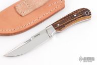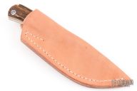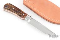 This knife by Dan Stranahan features a mirror polish finished blade with false top edge, .128" blade stock and .755" blade depth, full tang construction. The handle has a polished steel bolsters, stag grip with red liners and lanyard hole. Comes with a brown leather sheath. Has a few light scratches. Great condition otherwise.