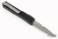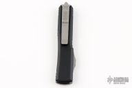 This knife from Microtech was the 2023 Blade Show Special. It has a double edged bayonet ground blade with an Apocalyptic finish. The handle is black frag pattern G-10 and black aluminum with a tip down Apocalyptic stainless clip and glass breaker at the butt. Comes with an original box and papers. New condition.