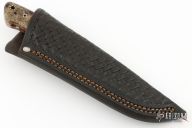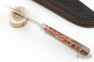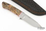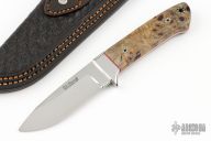 This knife by Dale Peacock features a mirror polished blade with .166" blade stock and 1.156" blade depth, file worked tapered tang construction. The handle has mirror polished stainless dovetail bolsters, Buckeye Burl scales, lanyard hole and red liners. Comes with a brown, hand tooled leather sheath. Cryogenic Treated HRC 62-63. New from maker!