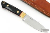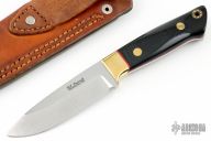 This knife by Dale Peacock features a two tone finished blade with mirror polished flats and satin bevels. The blade also features .170" blade stock and 1.181" blade depth, tapered tang construction. The handle has mirror polished brass dovetail bolsters, micarta scales, lanyard hole and red liners. Comes with a brown leather sheath. Cryogenic Treated HRC 62. New from maker!