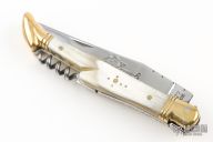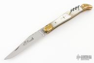 This Laguiole Knife has a mirror finished 12C27 stainless steel clip point blade with nail nick and filed spine. Has a corkscrew. The handle has brass bolsters/liners, stainless backspacer and buffalo horn covers.  Backspring has filework.  Excellent Condition.  Comes with original box.