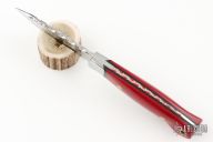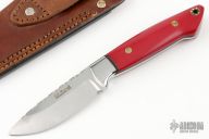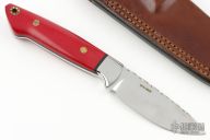 This knife by Dale Peacock features a two-tone finished blade with satin bevels, and mirror polished flats. The blade also features .171" blade stock and 1.158" blade depth, file worked tapered tang construction. The handle has mirror polished stainless dovetail bolsters, red micarta scales and black liners. Blade spine is file worked. Comes with a brown leather sheath. Cryogenic Treated HRC 62-63. New from maker!