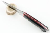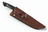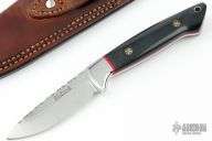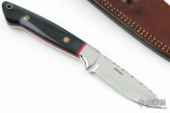 This knife by Dale Peacock features a two-tone finished blade with satin bevels, and mirror polished flats. The blade also features .174" blade stock and .994" blade depth, file worked tapered tang construction. The handle has mirror polished stainless dovetail bolsters, micarta scales and red liners. Blade spine is file worked. Comes with a brown leather sheath. Cryogenic Treated HRC 62-63. New from maker!