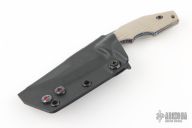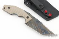 This POGN fixed blade from Bawidamann Blades has an Acid Etched Patina finished blade with notched thumbrest and sharpened and serrated top edge, .161" blade stock and 1.434" blade depth, full tang construction. The handle features tan G-10 grips by VZ Grips. Comes with kydex sheath. Excellent condition.