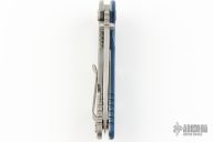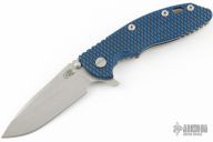 This XM-18 3.5" flipper by Rick Hinderer features a stonewashed blade with notched thumbrest and flipper. The handle has a stonewash titanium frame with a black/blue G-10 scale, a tip up or down reversible titanium clip and filler tab, lanyard hole at the butt. Comes with original box and extra hardware. Has been resharpened, has a couple light scratches, otherwise good condition.