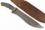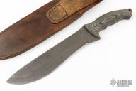 This Bolo by Ricky Fowler features a darkened recurve blade with swedge, .190" blade stock and 2.25" blade depth, full tang construction. The handle has pinned black canvas micarta scales with lanyard hole at the pommel. Comes with original leather belt sheath. Has scuffs and scratches, good condition otherwise.