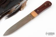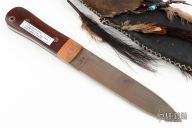 This knife by Ricky Fowler features a darkened drop point blade with, .189" blade stock and 1.384" blade depth, full tang construction. The handle has snakewood scales with copper bolsters and mosaic pins. Comes with a Native American style sheath. Has patina, scuffs and scratches. Wood has splits in it. Great condition otherwise.