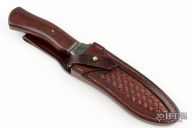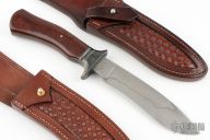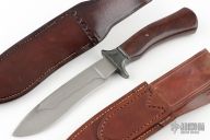 This fixed blade from Dave Kelly features a drop point blade with a hamon, .173" blade stock and 1.311" blade depth, hidden tang construction. The handle has a blued steel guard with fileworked and fluted spacers, desert ironwood burl grip with a single pin. Includes 2 hand tooled brown leather sheaths with belt loops. Has a few light scratches and patina, otherwise excellent condition.