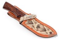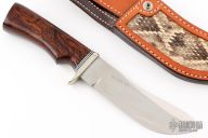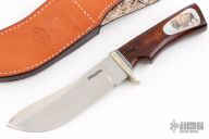 This Rick Bowles Skinner by Randall has a satin finished stainless steel blade with false top edge, .230" blade stock and 1.457" blade depth, hidden tang construction. The knife carries the small Randall logo stamp and the backside is etched with "RBSCRIM #05". The handle has a nickel silver guard and butt with a a desert ironwood grip with black and duralumin spacers. The grip has a piece of mammoth ivory inlaid in the handle with scrimshaw of a buffalo by Rick Bowles. Comes with brown leather sheath with snake skin inlay. Excellent condition. Comes with a Randall zippered case.