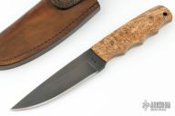 This Skinner from Ricky Fowler features a black finished blade with .125" blade stock and 1.116" blade depth, full tang construction. The handle has wood scales with mosaic pins and lanyard tube. Comes with a leather belt sheath and zipper case. Has a couple light scuffs, great condition otherwise.