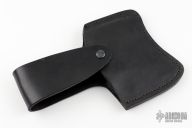 This Hatchet by Ricky Fowler features a darkened blade with .253" blade stock and 5.5" blade depth, full tang construction. The handle has pinned black canvas micarta scales with lanyard hole at the pommel. Comes with original leather belt sheath. Has scuffs and scratches, good condition otherwise.