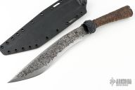This Chopper by James Helm features a hand forged clip point recurve blade with false top edge, .231" blade stock and 1.777" blade depth, hidden tang construction. The handle has black/brown paracord/hemp wrap. Comes with a kydex sheath. Hollow handle. New from maker!