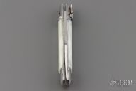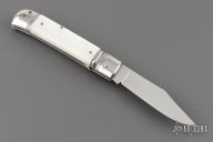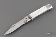 This Lever Lock Auto has a mirror polished stainless steel stonewashed drop point blade. Handle has pearlex scales, nickel silver front and rear bolsters, stainless steel liners and a nickel silver lock release button. Has some scuffs and patina, otherwise great condition.