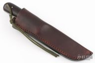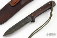 This Kephant by Lucas Forge, features a hammer forged drop point blade with a full tang construction. .124" Blade Stock 1.62" Blade Depth. The handle consists of wood scales and brass pins. There is a lanyard hole towards the butt of the handle. Includes hand stitched leather sheath with belt loop. Excellent condition.