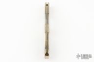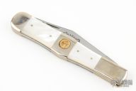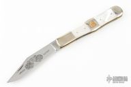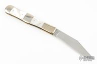 This Ka-Bar slipjoint is dated 1985. It has a mirror polished blade with nail nick. The handle has nickel silver bolsters, mother of pearl scales, brass liners, and stainless steel spring. Comes with original box. New old stock from old Ka-Bar dealer. Has a few light scratches. #0074