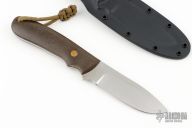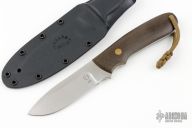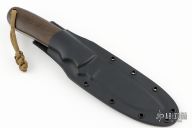 This K-54 Razorback Hunter by Dozier Knives features a satin finished blade with .138" blade thickness and 1.131" blade depth, full tang construction. The handle has green canvas micarta scales with brass pins. Right handed kydex sheath. Has some light scratches, excellent condition.