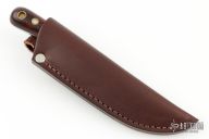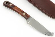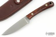 This knife by Battle Horse Knives features a drop point satin finished blade, .117" blade stock and .918" blade depth, full tang construction. The handle has desert ironwood scales. Comes with original box, stickers and brown leather sheath. Excellent Condition.