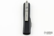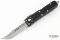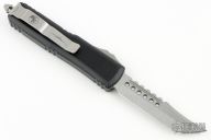 This UTX-85 OTF automatic by Microtech knives features a D/E stonewashed Hellhound blade, and a black aluminum handle with blasted hardware, tip down carry. Glass breaker. S/N 991. Dated 02/2024. Comes with original box and papers. Excellent condition.