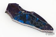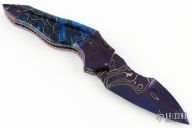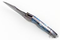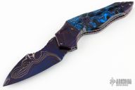 This Acolyte Automatic by Brandon Vallotton features a Timber Tiger Forge, "Low Layer w/ Nickle" blade. The handle has Timber Tiger Forge, "Low Layer" Damascus bolsters, front and rear, Voodoo Resins "Electric Kraken" scales, fileworked and anodized titanium liners, fileworked stainless steel backspacer.  Comes with COA and a padded hard case.  New from maker!